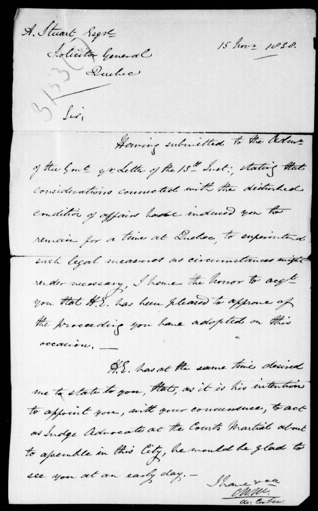 Le gouverneur approuve sa décision de rester à Québec pour le moment. Ce dossier fait partie d'un ensemble de documents intitulé : Correspondance des officiers du gouvernement en 1837, 1838 et 1839. Andrew Stuart, solliciteur général