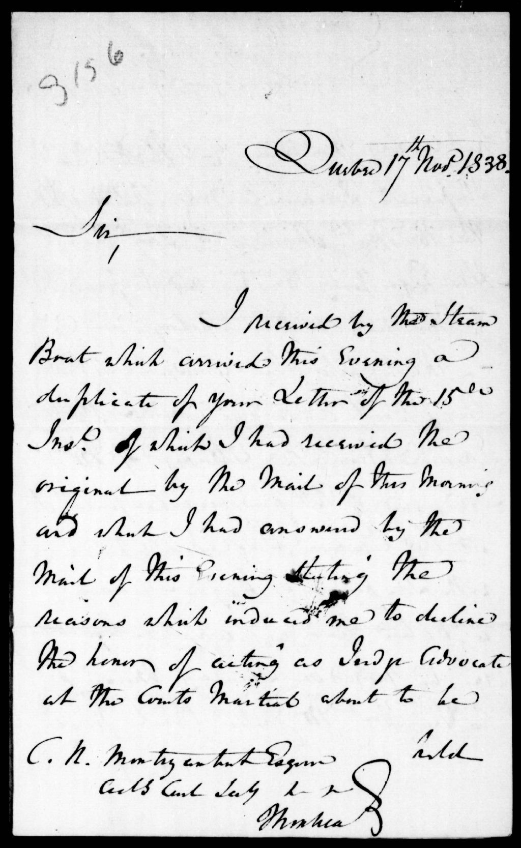 Lettre d'Andrew Stuart à C.-N. Montizambert, secrétaire civil, 17 novembre 1838, Archives nationales à Québec, Fonds Ministère de la Justice, (03Q,E17,S37,D3156).