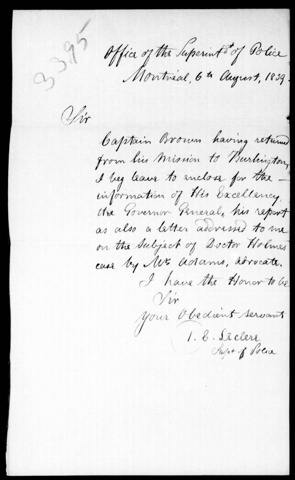 Lettre de Pierre-Édouard Leclerc, chef de police à Montréal, 6 août 1839, Archives nationales à Québec, Fonds Ministère de la Justice, (03Q,E17,S37,D3395).