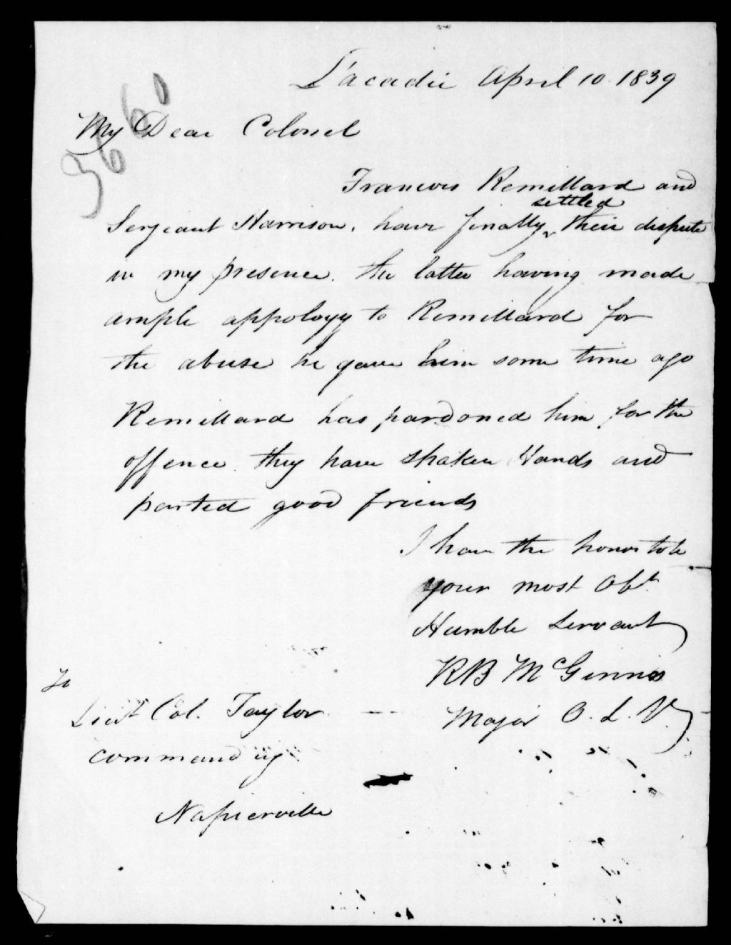 Lettre de R. R. McGinnis au lieutenant-colonel Taylor, datée de l'Acadie, 10 août 1839, Archives nationales à Québec, Fonds Ministère de la Justice, (03Q,E17,S37,D3660).