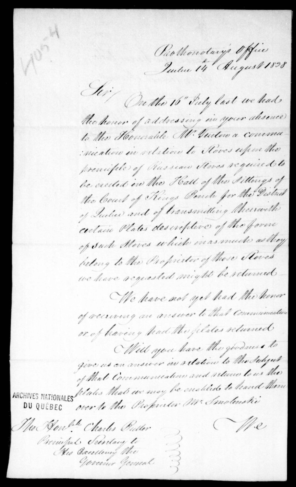 - Lettre de Perrault et Burroughs, protonotaires, à l'honorable Charles Buller