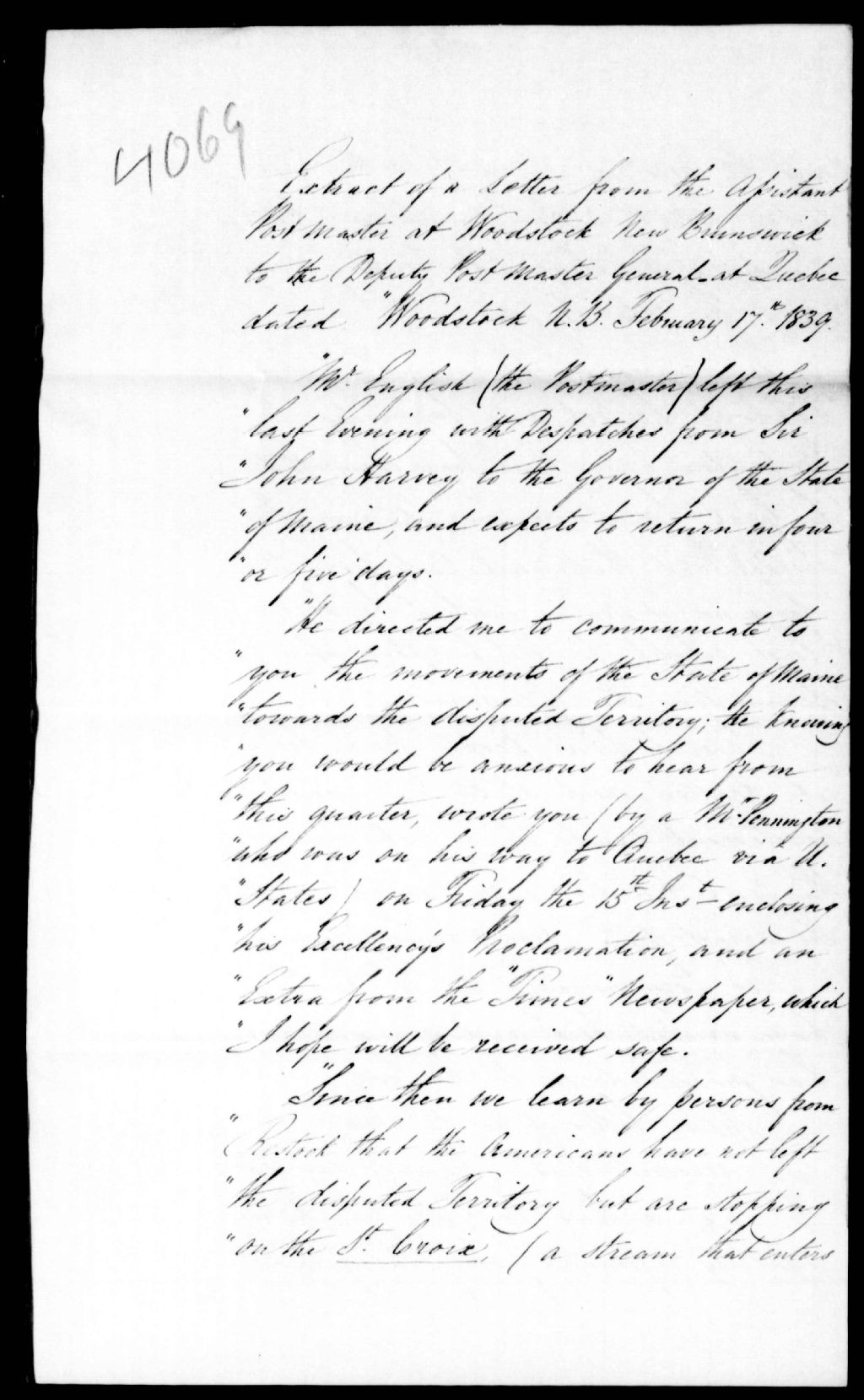 Extrait d'une lettre du maître de poste à Woodstock, Nouveau-Brunswick, au maître de poste de Québec