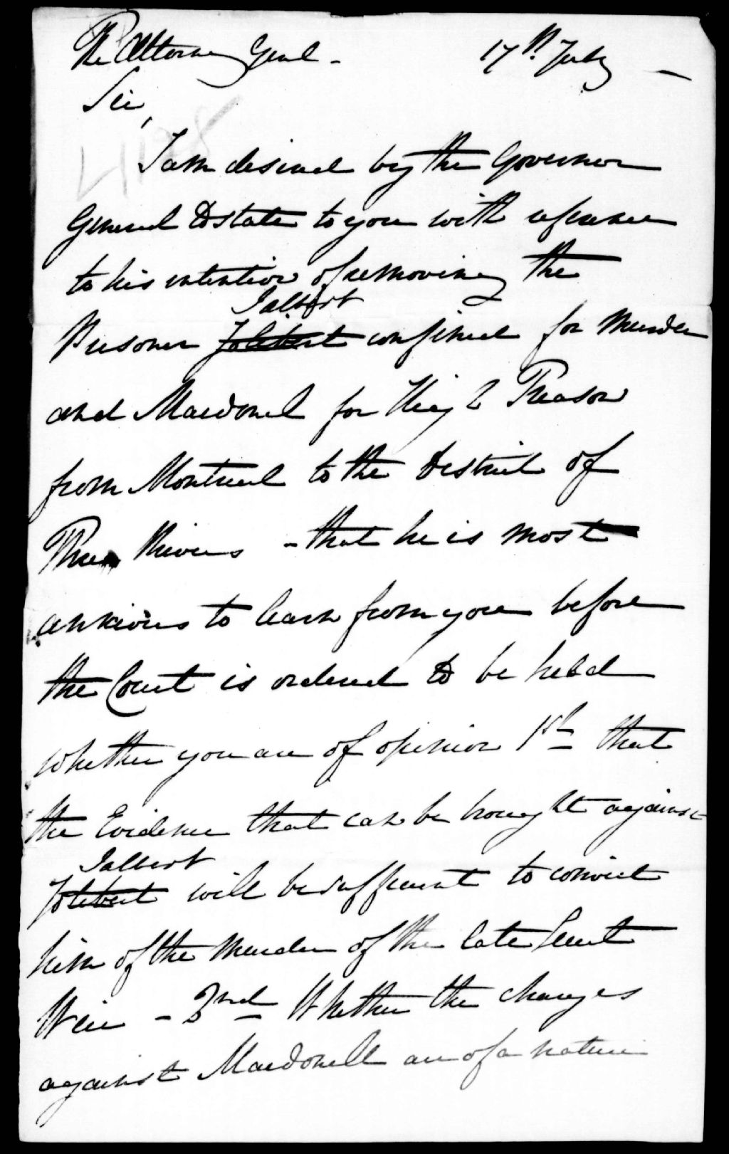 Lettre au procureur général, 17 juillet 1839, Archives nationales à Québec, Fonds Ministère de la Justice, (03Q,E17,S37,D4128).