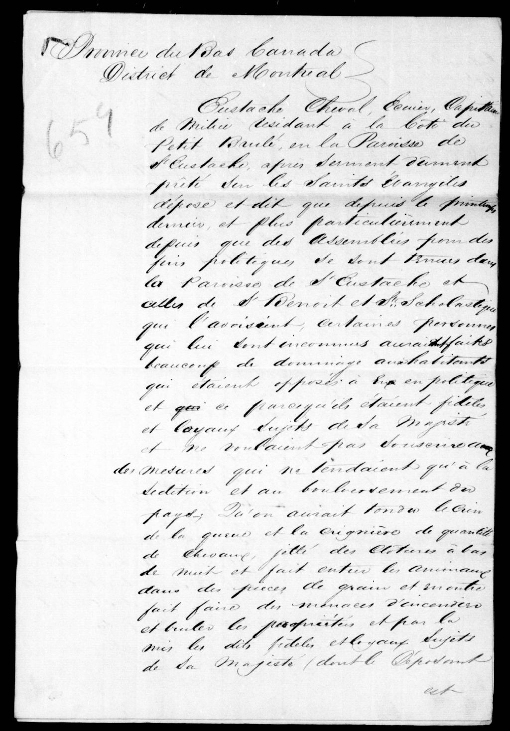 - Déposition d'Eustache Cheval contre Joseph Beautron dit Major, Édouard Beautron dit Major, Joseph Charon, qui lui ont fait des menaces et ont déchargé une arme à feu à travers les fenêtres de sa maison