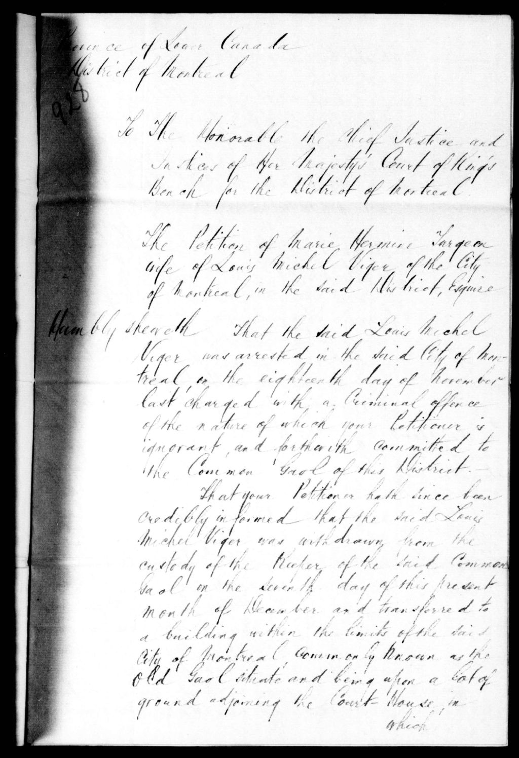Pétition de Marie-Hermine Turgeon, femme de Louis-Michel Viger, 26 décembre 1837, Archives nationales à Québec, Fonds Ministère de la Justice, (03Q,E17,S37,D928).