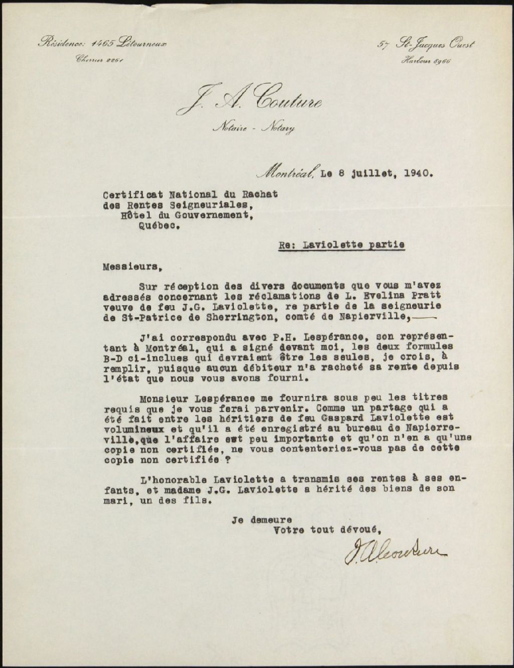 - Marie-Louise Evélina Pratt Veuve de J.-G. Laviolette, seigneurie de Laviolette