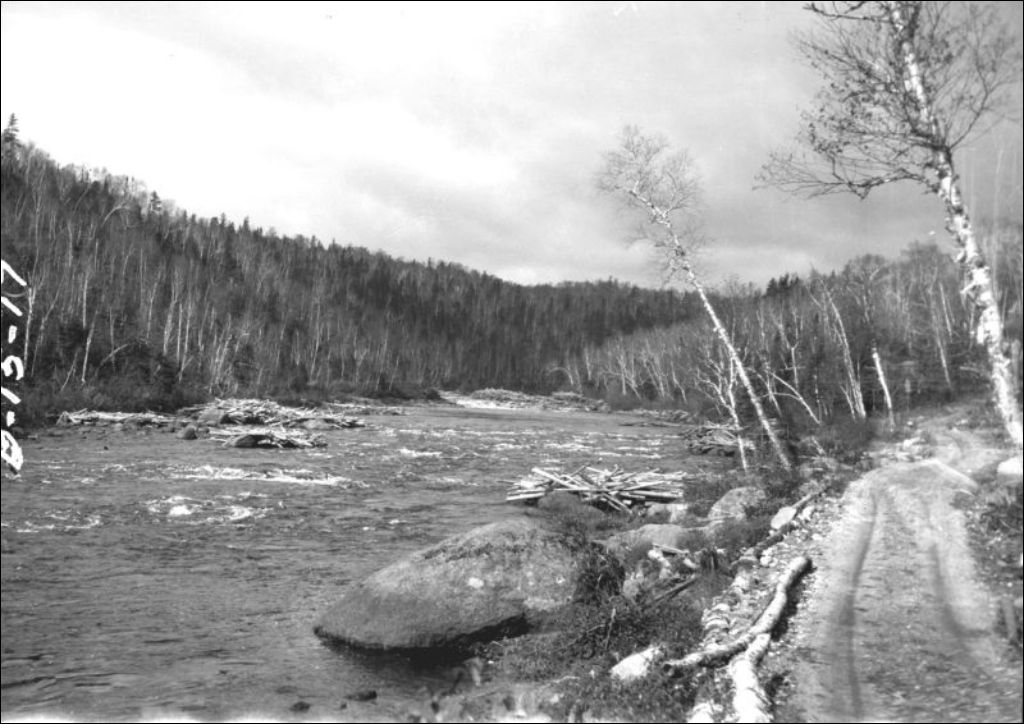 Rivière Shipshaw - Projet B: emplacement du barrage projeté, 1928, Archives nationales à Québec, Fonds Ministère de l'Environnement et de la Lutte contre les changements climatiques, (03Q,E57,S44,SS1,D157,PB15-17), Photographe non identifié.