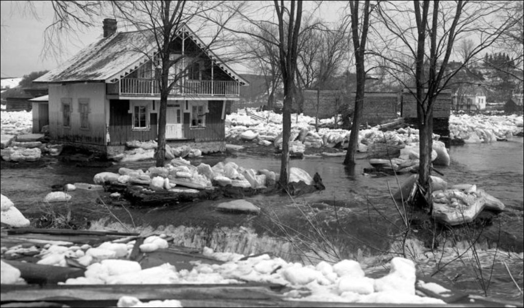 Débâcle de la rivière du Chêne, 1932, Archives nationales à Québec, Fonds Ministère de l'Environnement et de la Lutte contre les changements climatiques, (03Q,E57,S44,SS1,D168,PB24-19), Photographe non identifié.