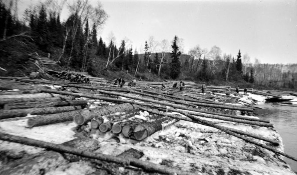 Roulage du bois dans l'embouchure du ruisseau Marteau sur la rivière Saint-Maurice, 1932, Archives nationales à Québec, Fonds Ministère de l'Environnement et de la Lutte contre les changements climatiques, (03Q,E57,S44,SS1,D76,PB24-73), Photographe non identifié.