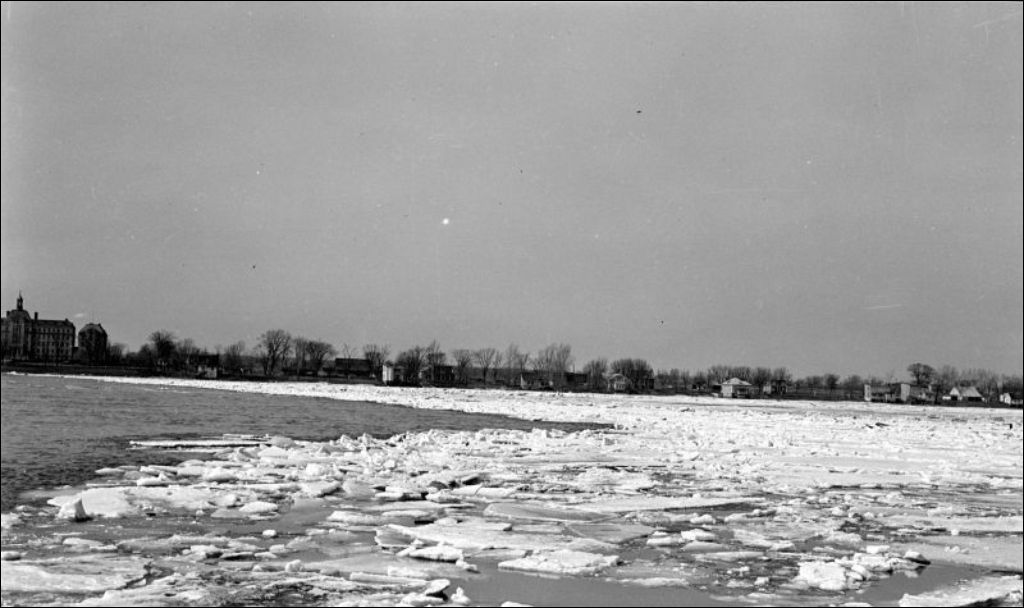 Débâcle de la rivière des Prairies près du pont Viau, 1933, Archives nationales à Québec, Fonds Ministère de l'Environnement et de la Lutte contre les changements climatiques, (03Q,E57,S44,SS1,D191,PB28-25), Photographe non identifié.
