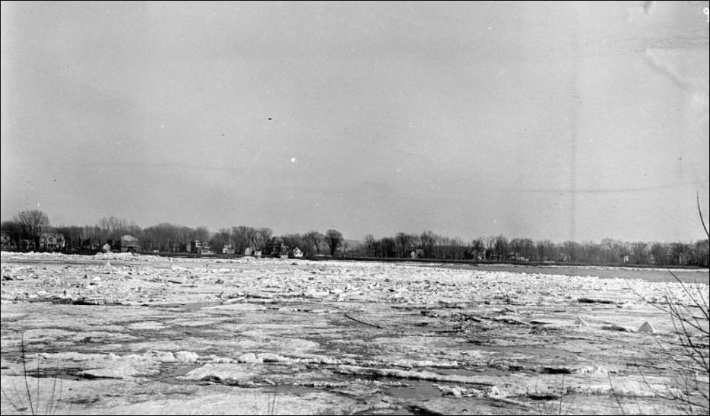 Débâcle de la rivière des Prairies près du pont Viau, 1933, Archives nationales à Québec, Fonds Ministère de l'Environnement et de la Lutte contre les changements climatiques, (03Q,E57,S44,SS1,D191,PB28-37), Photographe non identifié.