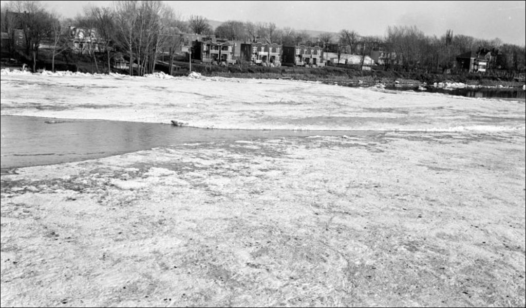 Débâcle de la rivière des Prairies près du pont Viau, 1933, Archives nationales à Québec, Fonds Ministère de l'Environnement et de la Lutte contre les changements climatiques, (03Q,E57,S44,SS1,D191,PB28-42), Photographe non identifié.