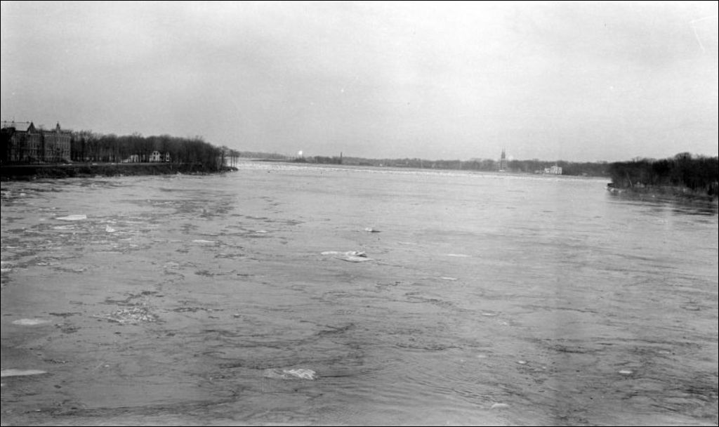 Débâcle de la rivière des Prairies près du pont Viau, 1933, Archives nationales à Québec, Fonds Ministère de l'Environnement et de la Lutte contre les changements climatiques, (03Q,E57,S44,SS1,D191,PB28-51), Photographe non identifié.