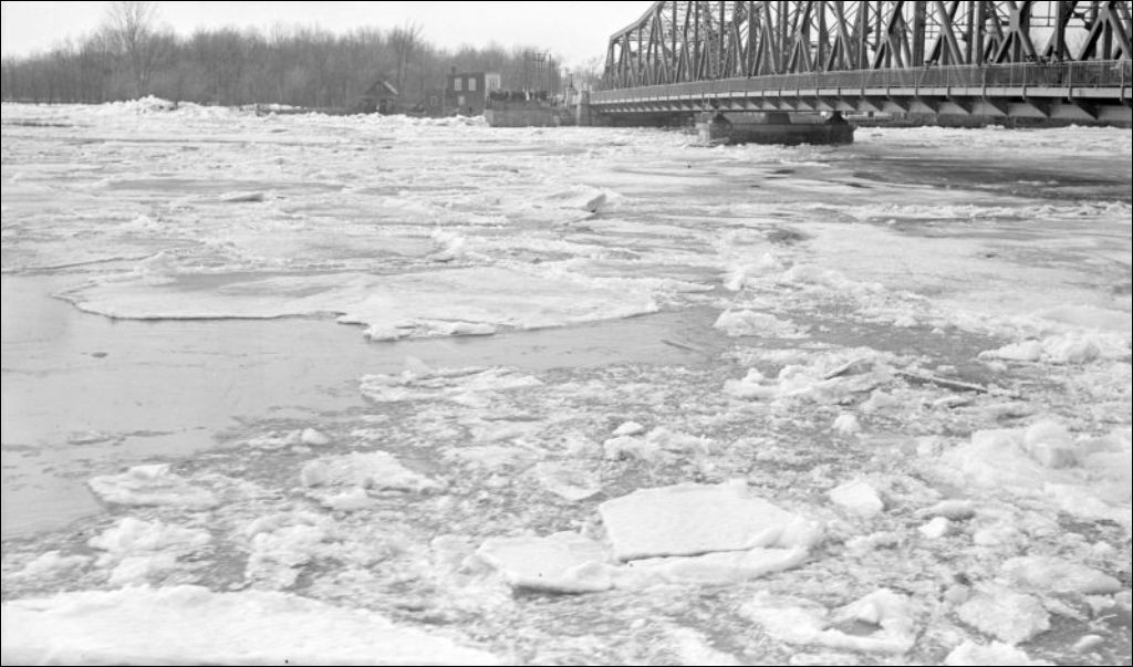 Débâcle de la rivière des Prairies à Cartierville, 1934, Archives nationales à Québec, Fonds Ministère de l'Environnement et de la Lutte contre les changements climatiques, (03Q,E57,S44,SS1,D191,PB31-66), Photographe non identifié.