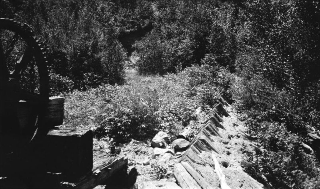 Rivière Picanoc: vue du barrage, 1934, Archives nationales à Québec, Fonds Ministère de l'Environnement et de la Lutte contre les changements climatiques, (03Q,E57,S44,SS1,D218,PB34-50), Photographe non identifié.
