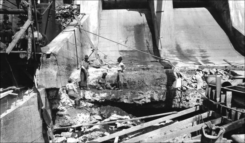 Lac Saint-François, construction du barrage Allard: Affouillement au dessus du radier, 1919, Archives nationales à Québec, Fonds Ministère de l'Environnement et de la Lutte contre les changements climatiques, (03Q,E57,S44,SS1,D93,PB6-36), Photographe non identifié.