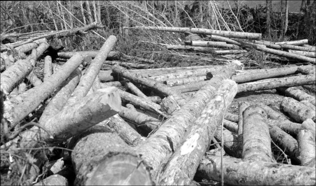 Rivière Matane: billots chez P.E. Filion, 1948, Archives nationales à Québec, Fonds Ministère de l'Environnement et de la Lutte contre les changements climatiques, (03Q,E57,S44,SS1,D209,PB66-62), Photographe non identifié.