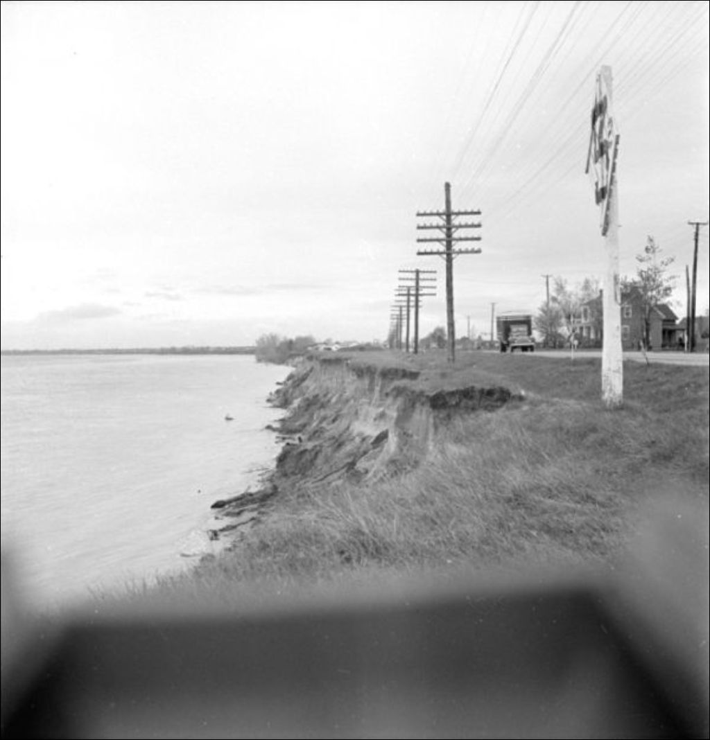 Érosion de la falaise nord près de Sainte-Marthe, 1947, Archives nationales à Québec, Fonds Ministère de l'Environnement et de la Lutte contre les changements climatiques, (03Q,E57,S44,SS2,D5,PD1-16), Photographe non identifié.