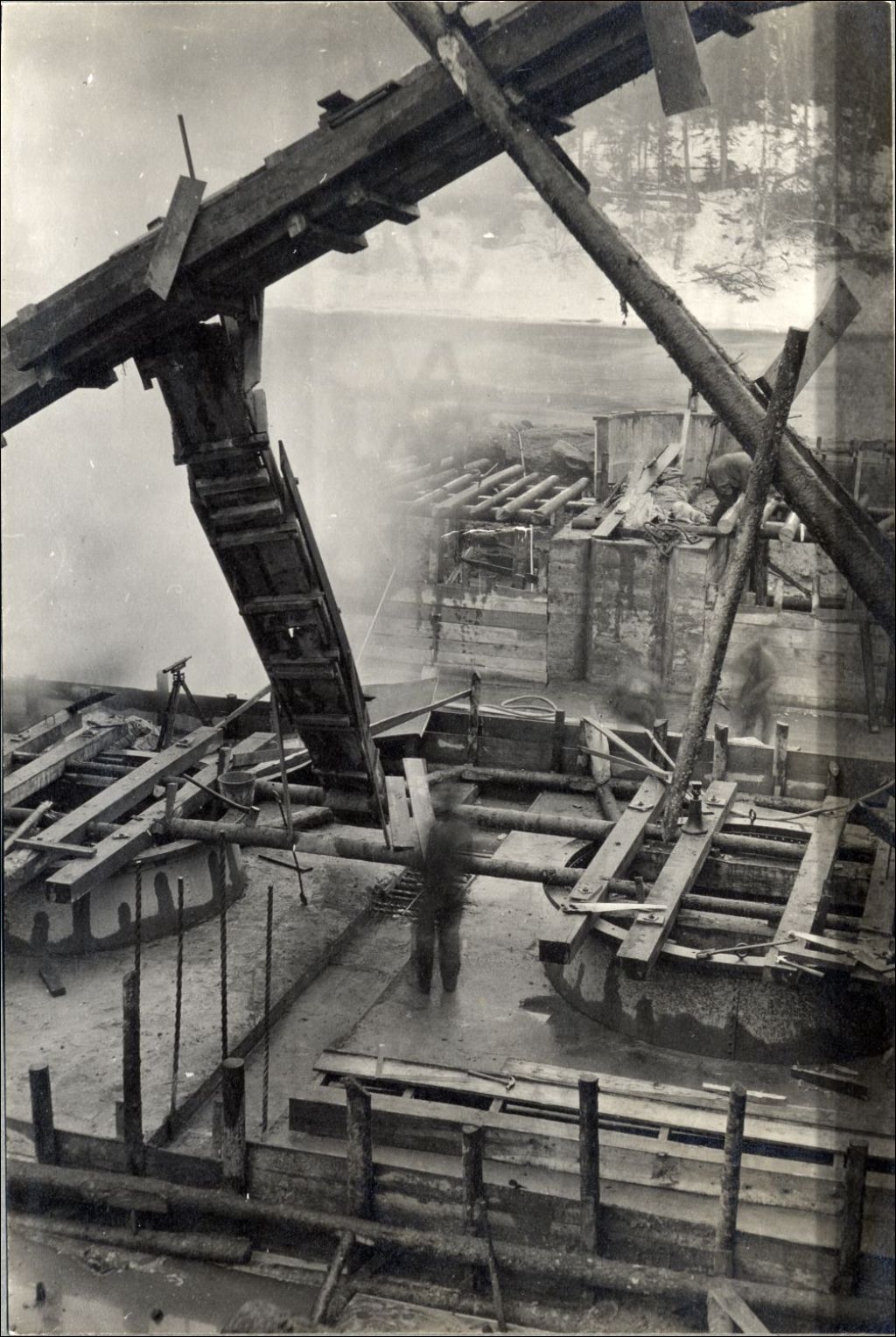 Rivière Saint-Maurice - Usine La Loutre - Construction - Pouring concrete on turbine floor, draft tubes in place, 15 avril 1916, Archives nationales à Québec, Fonds Ministère de l'Environnement et de la Lutte contre les changements climatiques, (03Q,E57,S44,SS1,D76,PY-433), Photographe non identifié.