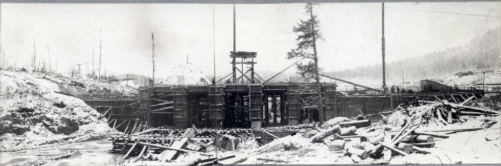 Rivière Saint-Maurice - Barrage Gouin - Construction - Temporary sluice ways and spillway sections East-Channel, 3 novembre 1916, Archives nationales à Québec, Fonds Ministère de l'Environnement et de la Lutte contre les changements climatiques, (03Q,E57,S44,SS1,D76,PY-523), Photographe non identifié.