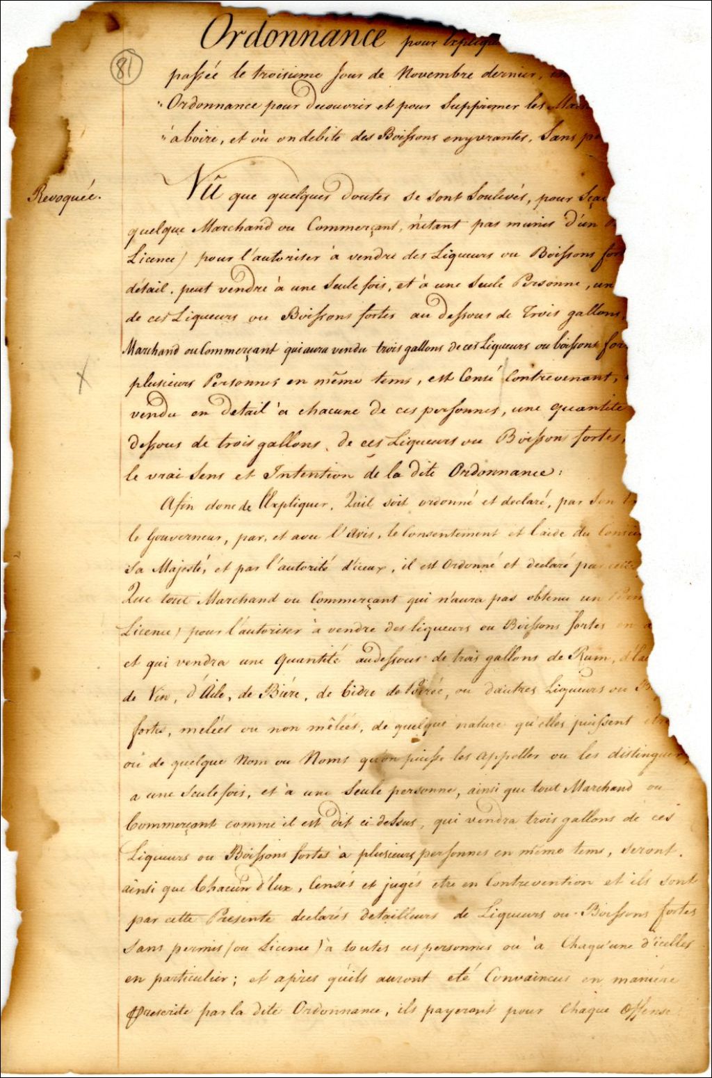 Ordonnance par le gouverneur James Murray et le Conseil du [Roi] pour expliquer une ordonnance du 3 novembre 1764 pour la supression des maisons où on débite des boissons fortes sans permis