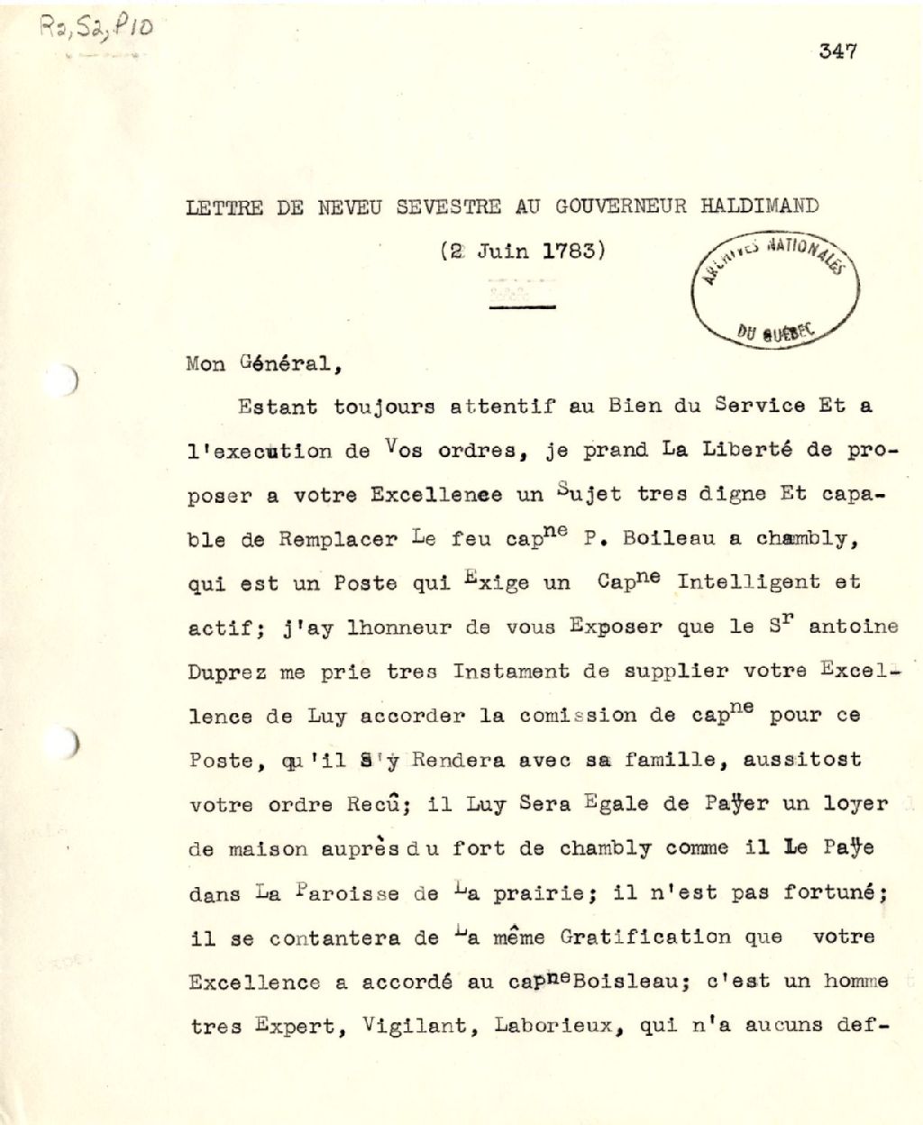 Lettre référence de Neveu Sevestre au gouverneur Frédérick Haldimand pour Antoine Duprez (Dupré) pour remplacer le capitaine P. Boily à Chambly. Demande d'abréger les jours de l'interdiction de l'enseigne P. Pinceauneau (Pinsonneau) et du sergent Jean-Baptiste Lachapelle, 2 juin 1783, Archives nationales à Québec, Fonds Gouverneurs, régime anglais, (03Q,R2,S2,P10).