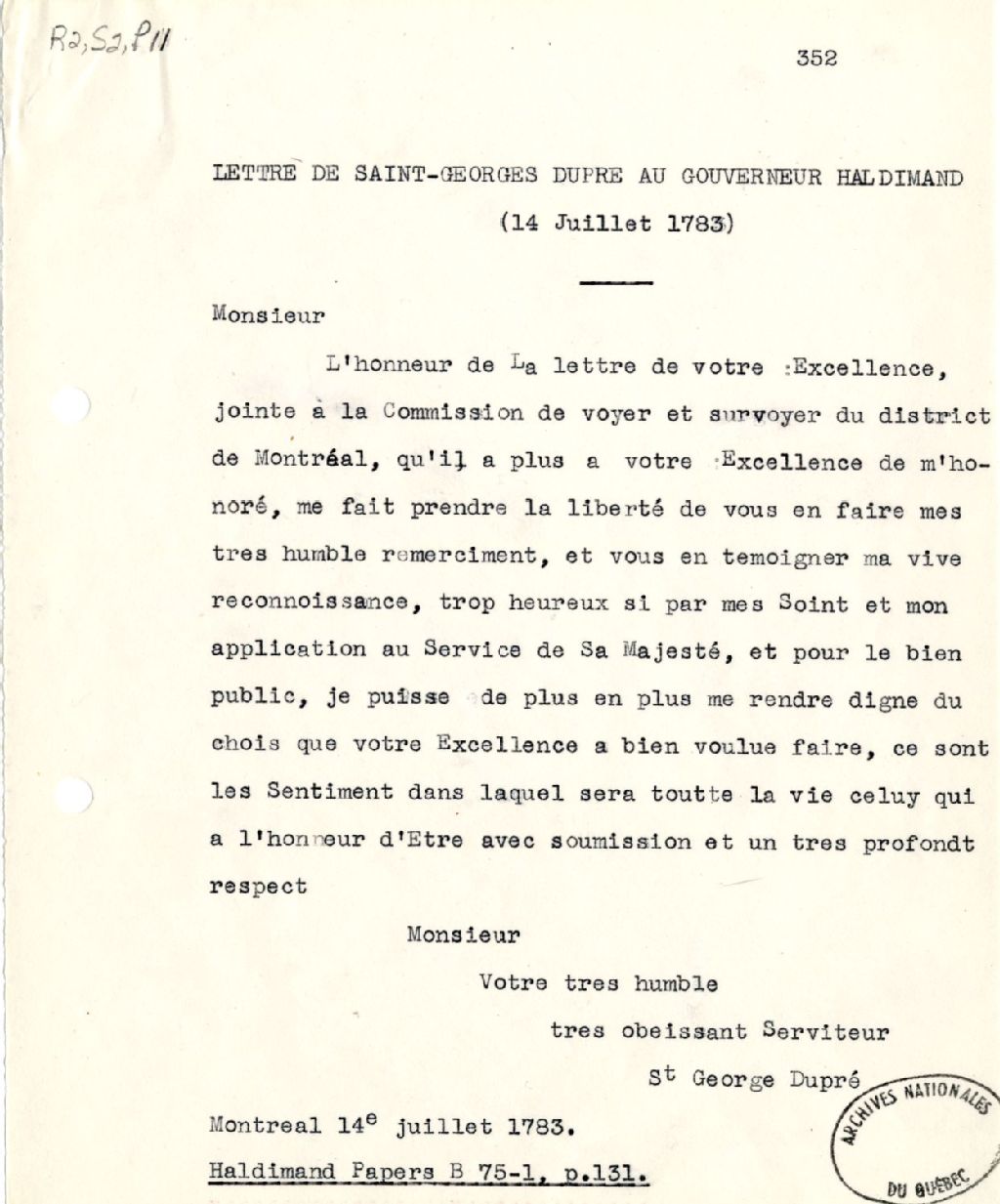 Lettre de remerciement de Saint-Georges Dupré au gouverneur Frédérick Haldimand pour le poste de voyer et survoyer (sic) du district de Montréal