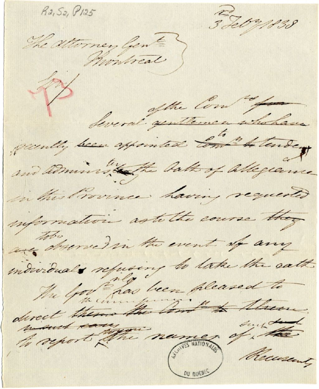 Lettre du secrétaire civil Stephen Walcott au procureur général. Il étudiera les cas des personnes qui seront rapportés comme ayant refusés de prêter le serment d’allégeance, 3 février 1838, Archives nationales à Québec, Fonds Gouverneurs, régime anglais, (03Q,R2,S2,P125).