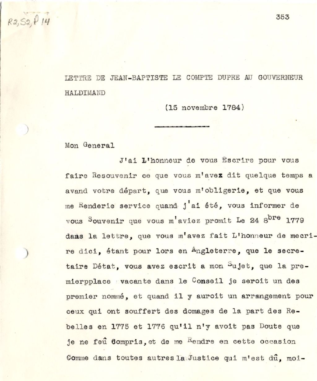 Lettre de Jean-Baptiste Le Compte Dupré au gouverneur Frédérick Haldimand pour lui rappeler la promesse d'une place comme conseiller, 15 novembre 1784, Archives nationales à Québec, Fonds Gouverneurs, régime anglais, (03Q,R2,S2,P14).