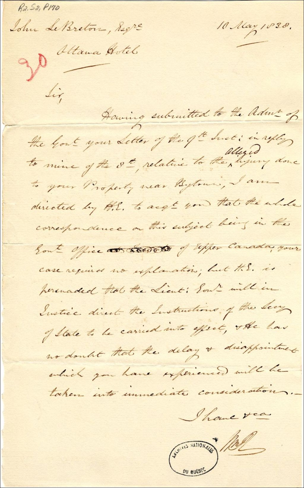 Lettre du secrétaire civil William Rowan pour l'administrateur du gouvernement, John Colborne, à John LeBreton. Le lieutenant-gouverneur du Haut-Canada va aller en toute justice appliquer les directives du secrétaire d'état pour les mettre en action dans sa demande d'indemnité à propos des dommages sur sa propriété, 10 mai 1838, Archives nationales à Québec, Fonds Gouverneurs, régime anglais, (03Q,R2,S2,P170).