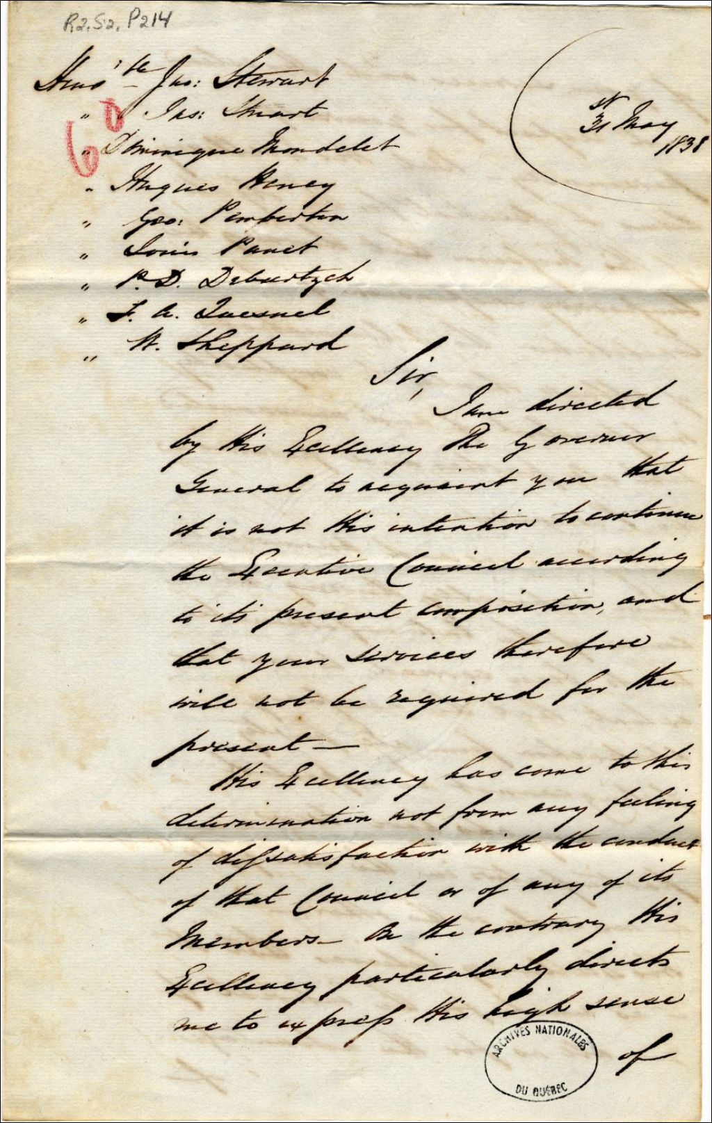 Prospectus écrit aux membres du Conseil exécutif. Le gouverneur croit que dans les circonstances, il doit être débarrassé de toutes les entraves et considère qu’il doit garder sa pleine liberté d’agir. C’est pourquoi, il les remercie de leurs services et leur annonce que son intention est de suspendre le Conseil exécutif jusqu’à nouvel ordre, 31 mai 1838, Archives nationales à Québec, Fonds Gouverneurs, régime anglais, (03Q,R2,S2,P214).