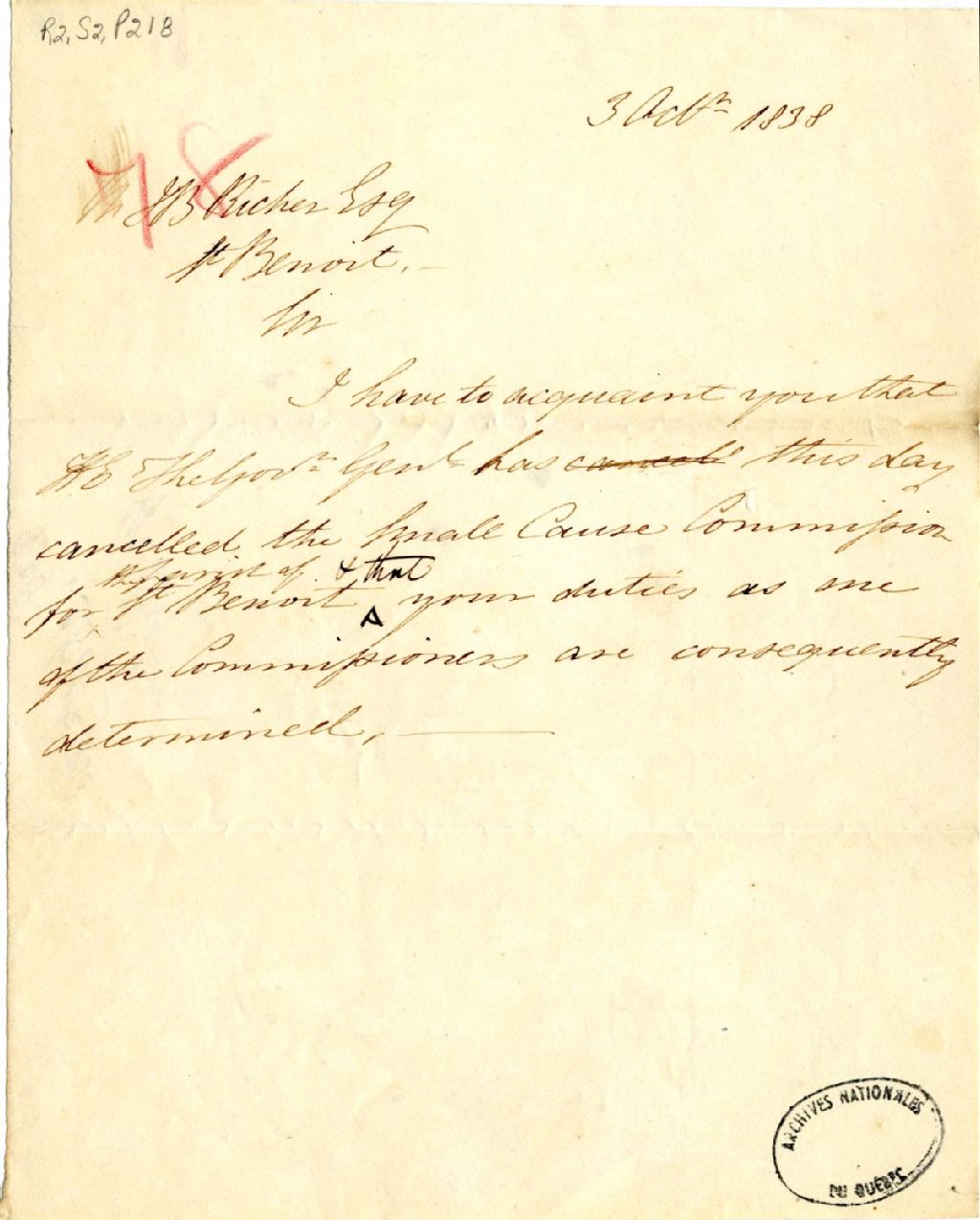 Lettre à J. -B. Richer, Saint-Benoît. La commission des petites causes à Saint-Benoît a été abolie, 3 octobre 1838, Archives nationales à Québec, Fonds Gouverneurs, régime anglais, (03Q,R2,S2,P218).