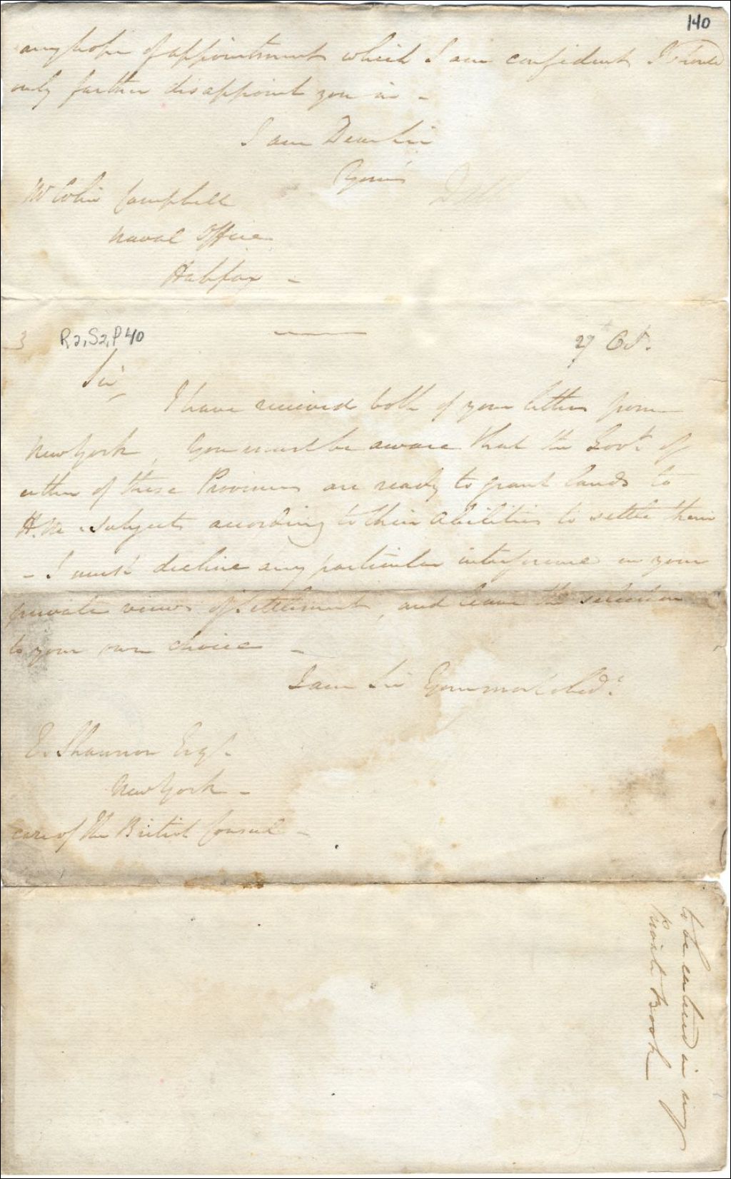 Lettres à Shannon, consulat britannique à New-York par le gouverneur George Ramsay, 9e comte de Dalhousie. À propos de concessions de terre dans les colonies britanniques