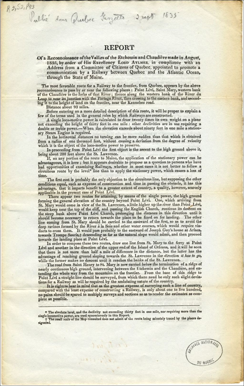 Rapport de P. Yule, capitaine des ingénieurs royaux, au gouverneur Lord Aylmer à propos de la possibilité et des conditions de construction d'un chemin de fer entre Québec et l'océan Atlantique à travers l'État du Maine. La route la plus favorable passe par la rivière Chaudière, la rivière du Loup et la rivière du Portage, 22 août 1835, Archives nationales à Québec, Fonds Gouverneurs, régime anglais, (03Q,R2,S2,P43).