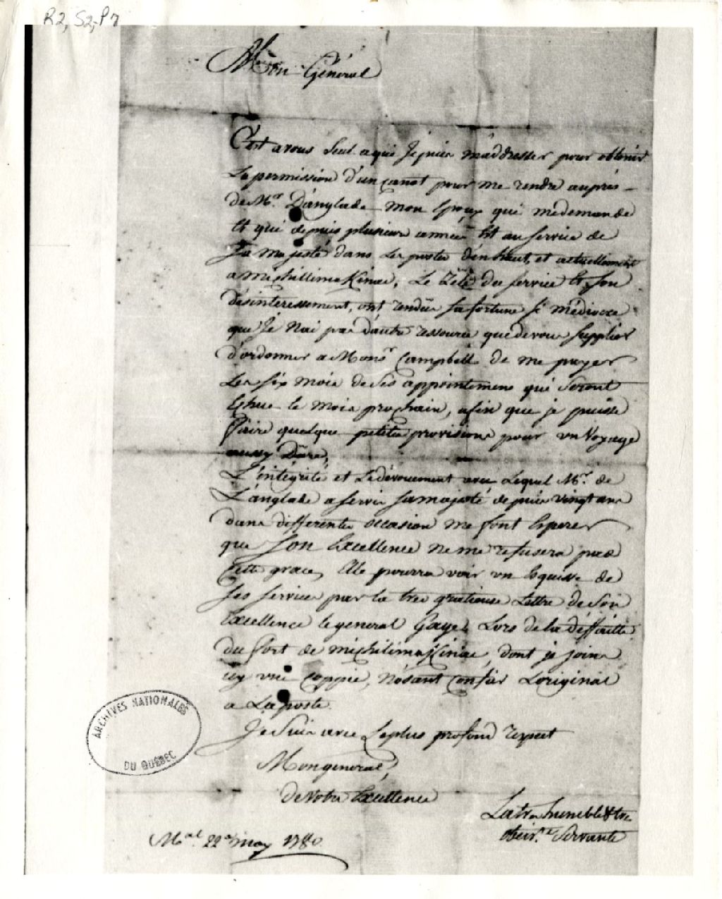 Lettre de madame D'Anglade (Langlade) au gouverneur Frédérick Haldimand concernant la demande de permission d'obtenir un canot, de payer les six mois d'appointements (salaire) de son époux pour les provisions qu'elle compte acquérir pour rejoindre son mari au service de Sa Majesté à Michilimakinac, 22 mai 1780, Archives nationales à Québec, Fonds Gouverneurs, régime anglais, (03Q,R2,S2,P7).