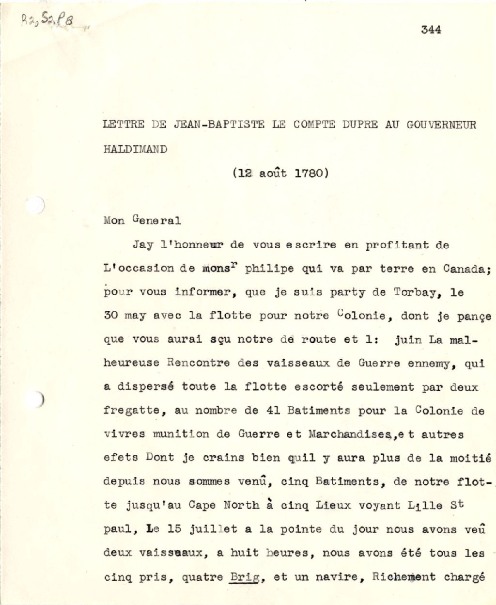 Copie d'une lettre de Jean-Baptiste Le Compte Dupré au gouverneur Frédérick Haldimand concernant la rencontre de vaisseaux de guerre (corsaires) américains lors de leur traversée. Il était parti de Torbay en Angleterre, 12 août 1780, Archives nationales à Québec, Fonds Gouverneurs, régime anglais, (03Q,R2,S2,P8).