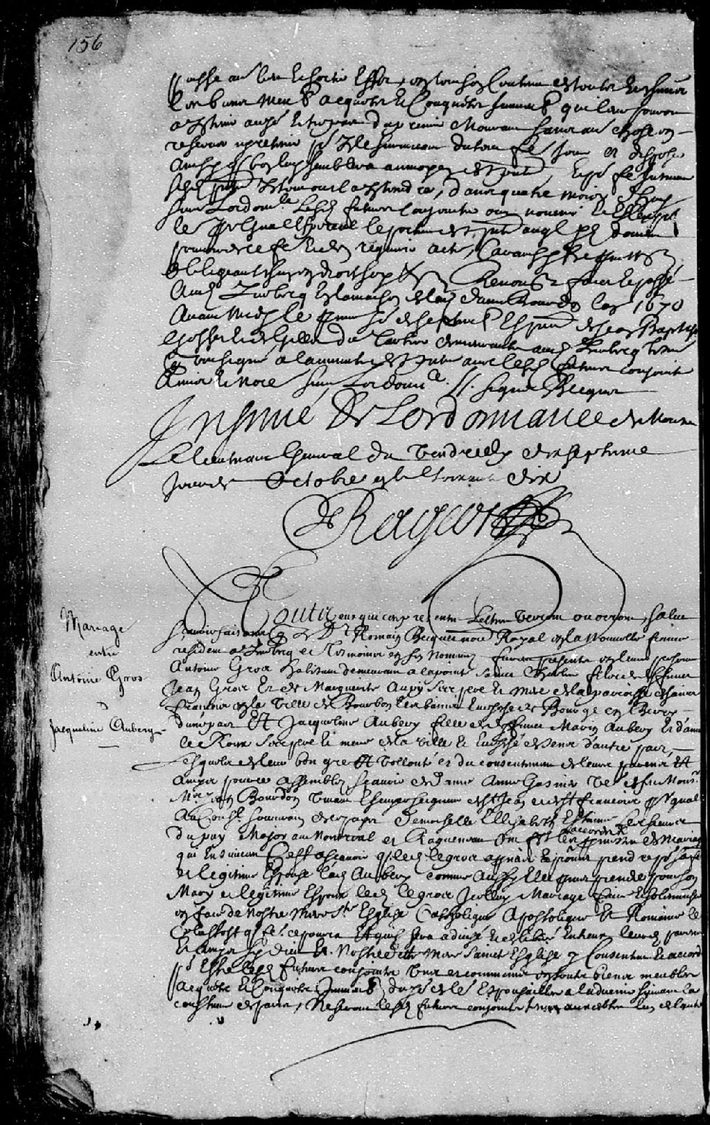 Mariage entre Antoine Gros, habitant demeurant à la Pointe-Saint-Charles, fils du feu Jean Gros et de Marguerite Aupy, ses père et mère de la paroisse de Saint-François en la ville de Bourbonne-les-Bains, et Jacqueline Aubery (Aubry), fille du feu Marin Aubery (Aubry) et de Anne LeRoux, ses père et mère de la ville et évêché de Sées, sont présent dame Anne Gasnier (Gagné - Gagnier), veuve du feu sieur Jean Bourdon, de son vivant écuyer et seigneur de Saint-Jean et de Saint-François, conseiller au Conseil souverain, demoiselle Élizabeth Étienne, le sieur Dupuy (Dupuis), major à Montréal, et Raguenaud, amis des futurs époux, Jean-Baptiste Gosset et Gilles Dutartre, sont témoins