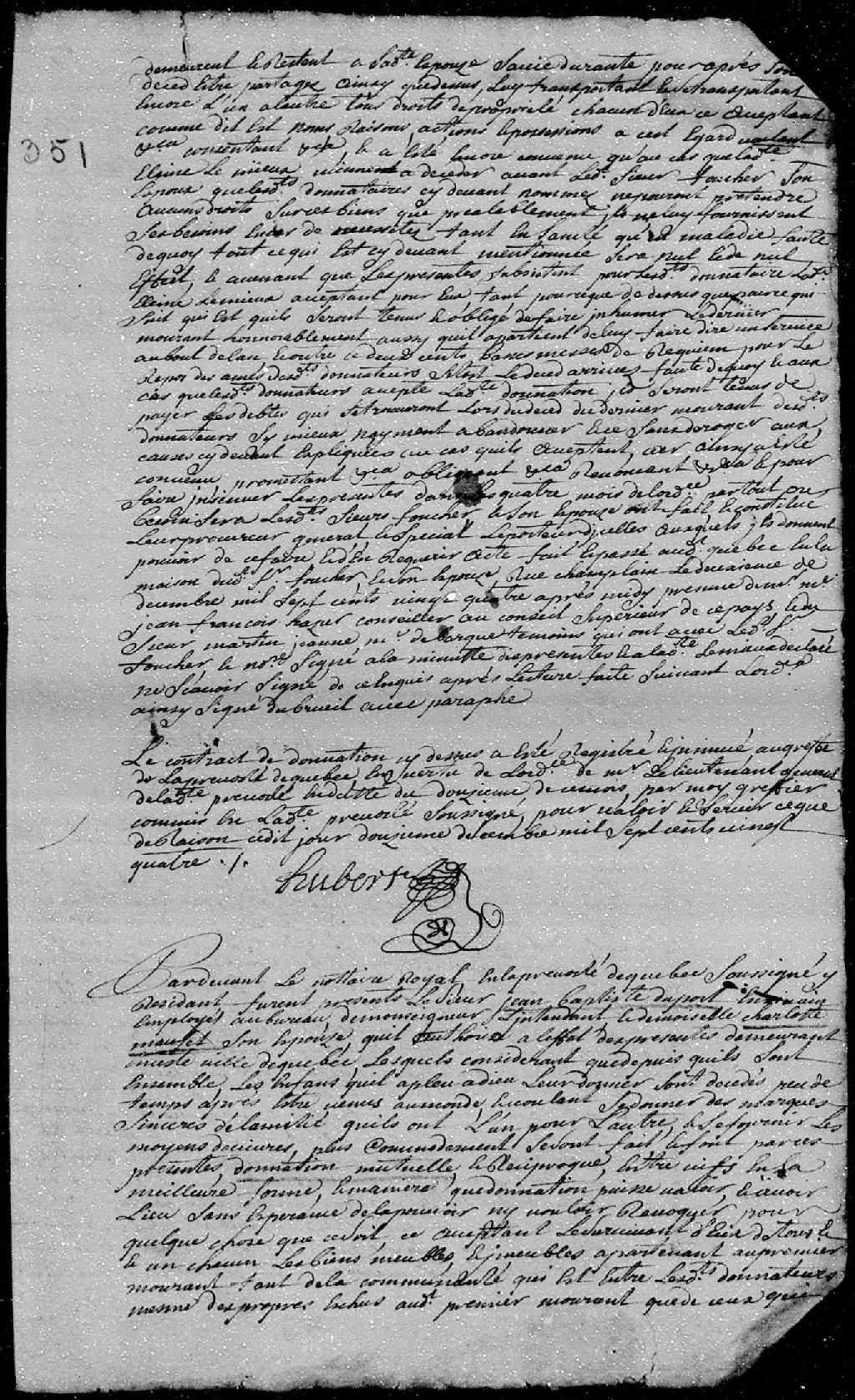 Donation mutuelle entre Jean-Baptiste Dupont, écrivain employé au bureau de l'intendant; et Charlotte Maufet (Maufay), son épouse, de tous leurs biens meubles et immeubles; ladite donation est passée pardevant maître Louet, notaire royal en la Prévôté de Québec