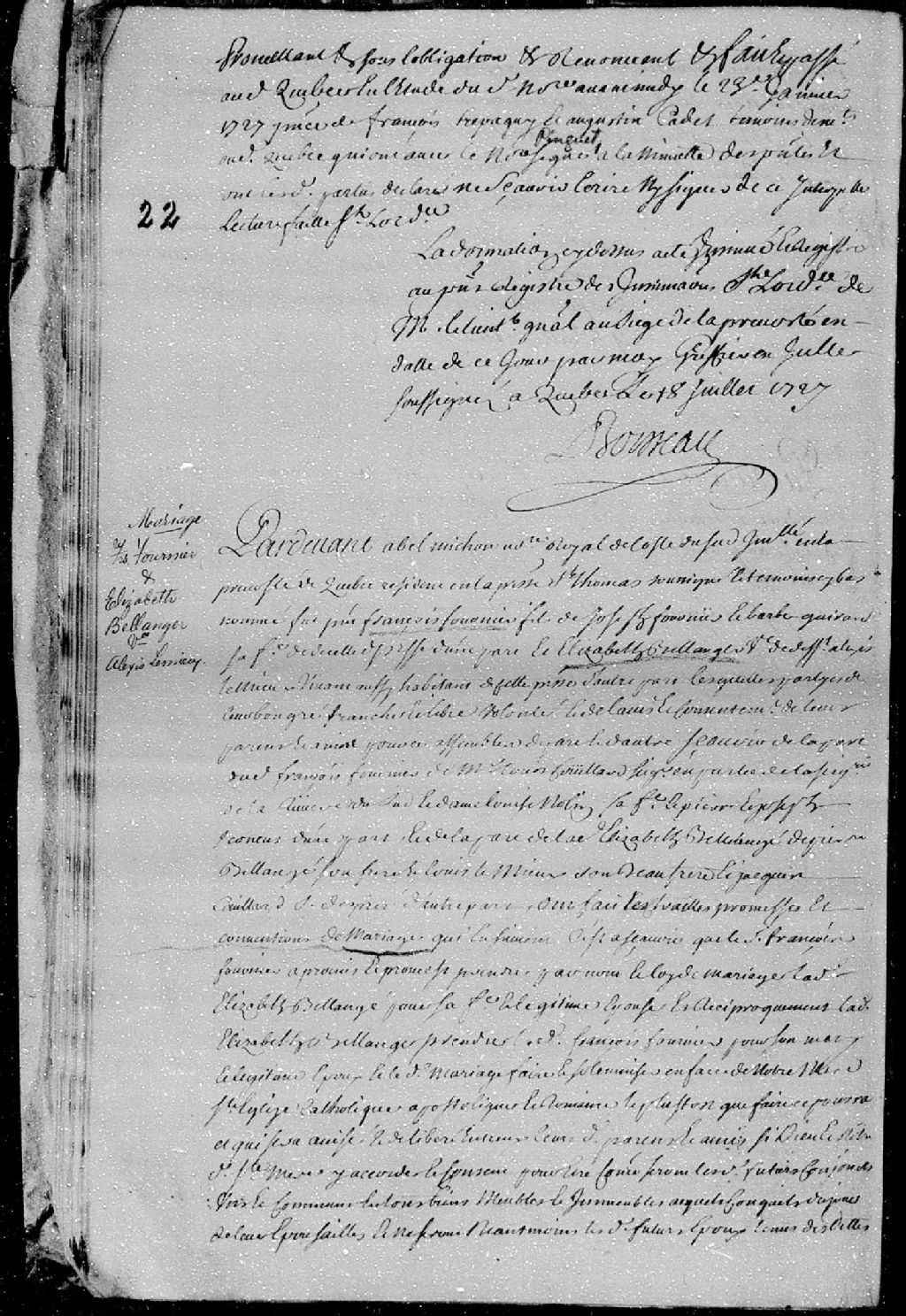 Contrat de mariage passé pardevant Abel Michon, notaire royal de la côte du Sud, entre François Fournier, fils de Joseph Fournier et Barbe Girard, ses père et mère, de la paroisse Saint-Thomas; et Élisabeth Bélanger, veuve de défunt Alexis Lemieux, vivant habitant dudit lieu
