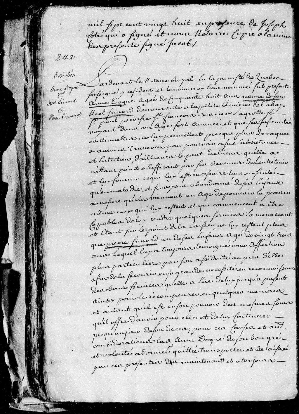 La pièce se compose de la donation par Anne Dogué (Dodier), âgée de 58 ans, veuve de défunt Noël Simard, demeurant à la Petite-Rivière de la Baie-Saint-Paul, paroisse Saint-François-Xavier (Petite-Rivière-Saint-François); à Pierre Simard, un de ses enfants âgé de 23 ans, demeurant avec la donatrice audit lieu de la Baie-Saint-Paul; à savoir une terre de trois perches et quatorze pieds de front sur toute la profondeur qu'elle peut avoir, sise et située en la côte de Beaupré, paroisse Saint-Joachim; ladite donation est passée pardevant maître Pinguet, notaire royal en la Prévôté de Québec.
