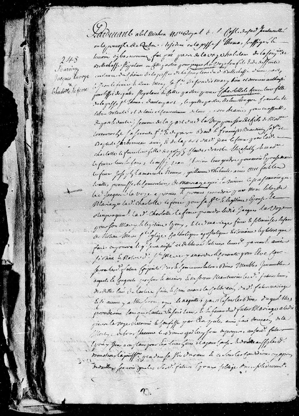 Contrat de mariage passé pardevant Abel Michon, notaire royal de la côte du Sud, entre Jacques Lavoie, fils de Pierre Lavoie, habitant de la seigneurie de Bellechasse, époux en secondes noces de Madeleine Tourneroche, et de défunte Constance Duchesne, ses père et mère, de la paroisse de L'Assomption; et Charlotte Lefevre (Lefebvre), fille de Jean Lefevre et de Reine Meny (Mesny), de la paroisse Saint-Thomas