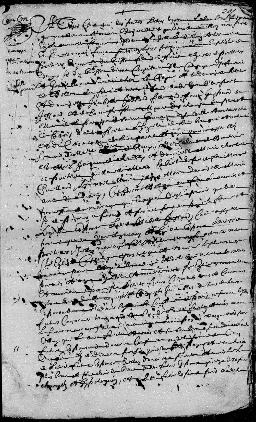 - La pièce se compose du mariage entre Jean-Baptiste Poitiers du Buisson, fils du feu Charles de Poitiers, de son vivant écuyer, sieur du Buisson, capitaine d'une compagnie d'infanterie, gentilhomme servant chez la reine, et de demoiselle Hélène de Belleau, ses père et mère de la ville de Lyon, et Isabelle (Élisabeth) Jossard, fille du feu Gaspard de Jossard et de Marie Deschamps, ses père et mère de la paroisse de Saint-Gervais en la ville et archevêché de Paris, sont présent messire Daniel de Rémy, messire Claude de Bouteroue, messire Jacques de Chambly, demoiselle Marie-Charlotte de Poitiers, Guillemette-Marie Hébert, veuve du feu sieur Couillard, le sieur Noël Morin, Agnès Morin, demoiselle Marie-Anne Dusaussay, et Catherine Belleau, amis des futurs époux, Jean-Baptiste Gosset et Jacques Bouchard, demeurant à Québec, sont témoins.
