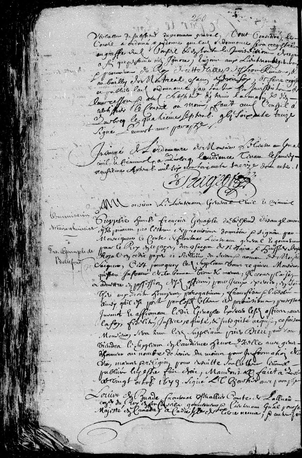 Commissions de notaire royal garde-note et de huissier à François Genaple de Bellefond, ledit poste étant auparavant exercé par maître Romain Becquet, comprend la requête audit Genaple pour qu'il donne ses lettres de provisions (20 octobre 1673), ladite commission de huissier (11 octobre 1673), ladite commission de notaire royal garde-note (18 octobre 1673), 20 octobre 1673 [Document insinué le 20 octobre 1673], Archives nationales à Québec, Fonds Cour supérieure. District judiciaire de Québec. Insinuations, (03Q,CR301,P160).