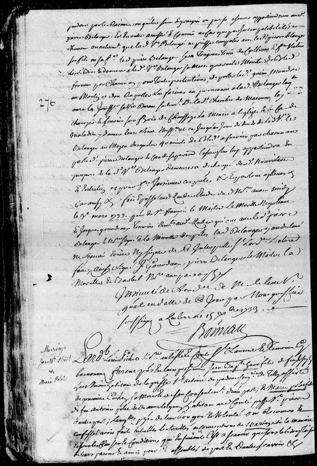 Contrat de mariage passé pardevant Louis Pichet, notaire royal en l'île et comté de Saint-Laurent (île d'Orléans), entre Jean-Baptiste Huot, fils de feu Joseph Huot, vivant habitant de la paroisse Saint-Antoine-de-Padoue, seigneurie de Tilly, et de Geneviève Cochon (Cauchon), ses père et mère; et Marie Polet (Paulet - Pollet - Poulet), fille de feu Antoine Polet et d'Anne Loignon, ses père et mère, habitant audit comté de Saint-Laurent, paroisse Saint-Pierre