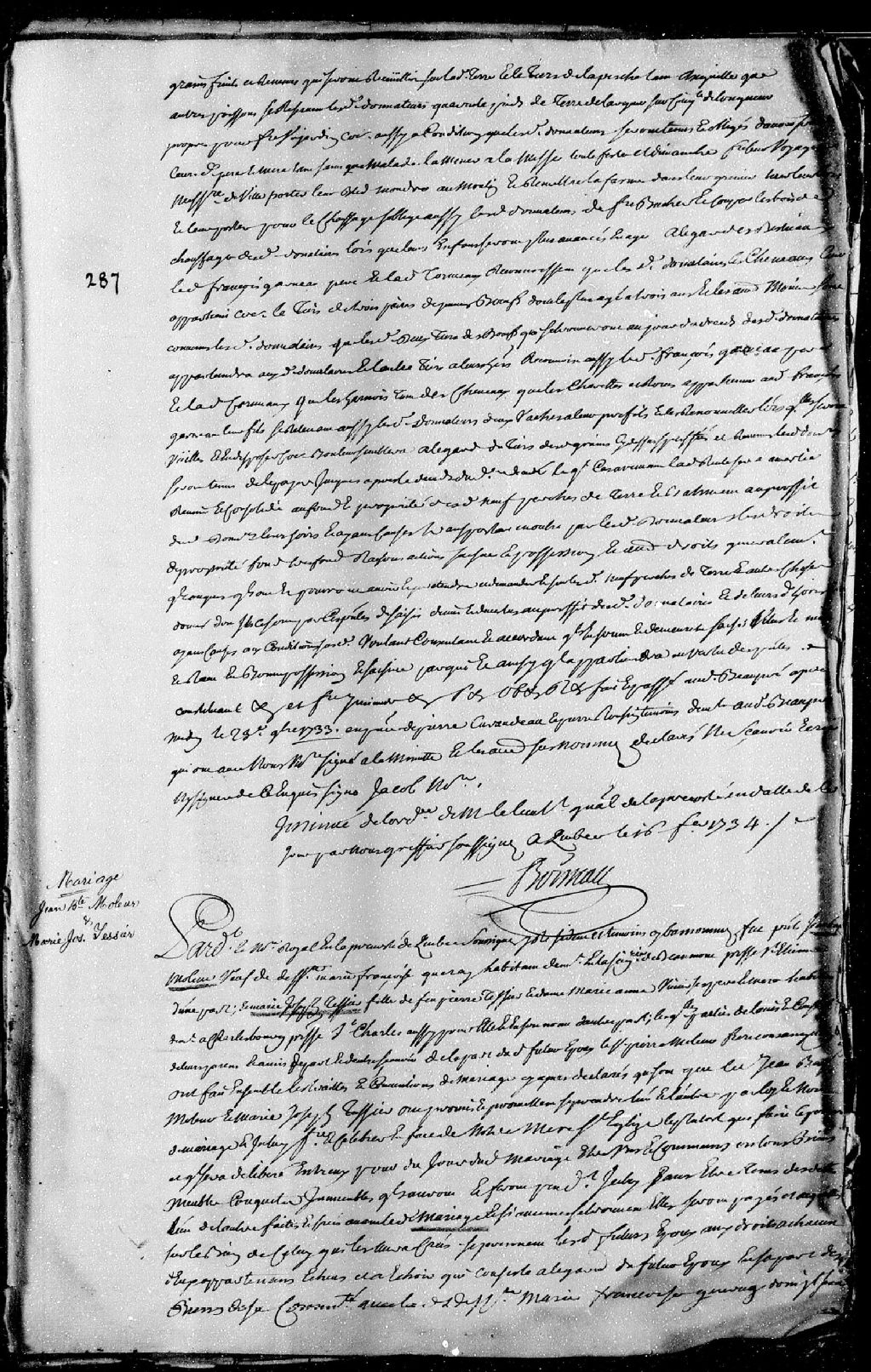 Contrat de mariage passé pardevant maître Rageot, notaire royal en la Prévôté de Québec, entre Jean-Baptiste Moleur (Molleur), veuf de défunte Marie-Françoise Queray (Quéret), habitant demeurant en la seigneurie de Beaumont, paroisse Saint-Étienne; et Marie-Josèphe Tessier, fille de feu Pierre Tessier et de Marie-Anne Vivier, ses père et mère, habitants demeurant à Charlesbourg, paroisse Saint-Charles