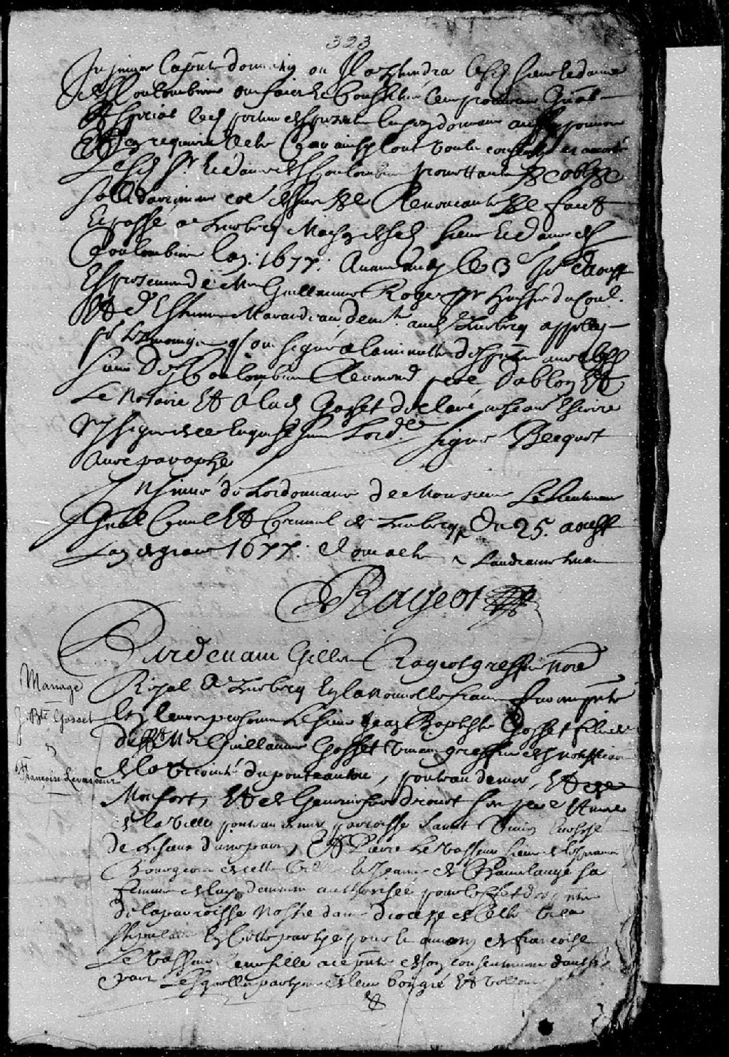 - La pièce se compose du mariage entre le sieur Jean-Baptiste Gosset, fils du feu maître Guillaume Gosset, de son vivant greffier et notaire de la vicomté du Pont-Audemer et de Monfort, et de Geneviève Drouet, ses père et mère de la ville de Pont-Audemer en la paroisse de Saint-Vivien en l'évêche de Lisieux, et Françoise LeVasseur, fille de Pierre LeVasseur, sieur de Lespérance, bourgeois de Québec, et de Jeanne de Chaverlange, ses père et mère de la paroisse Notre-Dame de Québec, lesdits sieur et dame LeVasseur stipulant pour leur fille absente, sont présent monsieur le comte de Frontenac, conseiller du Roi en son Conseil, gouverneur et lieutenant général pour Sa Majesté en Nouvelle-France, messire Jacques Duchesneau, chevalier, seigneur de la Poussinière (Poupinière) et d'Ambraud (d'Ambrault), conseiller du Roi en ses Conseils d'État et privé, intendant de justice, police et finance en Nouvelle-France, les sieurs Dupont et Damours, conseillers au Conseil souverain en Nouvelle-France, Louis-Théandre Chartier, écuyer, sieur de Lotbinière, conseiller du Roi en son Conseil, lieutenant général civil et criminel à Québec, demoiselle Élizabeth Damours, son épouse, demoiselle Françoise Charlier (Chartier), Bertrand Chesnay (Chenay), sieur de la Garenne (LaGarenne), bourgeois de Québec, les sieurs Marin, Petit, Caddé et Charon (Charron), marchands et bourgeois de Québec, amis des futurs époux, Adrien Michelon et Jacques Turet, demeurant à Québec, sont témoins.