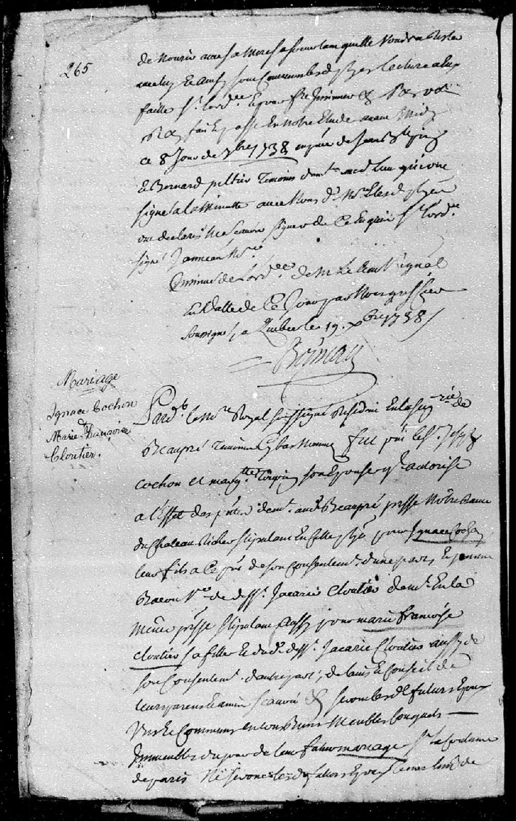 Contrat de mariage passé pardevant maître Jacob, notaire royal en la seigneurie de Beaupré, entre Ignace Cochon (Cauchon), fils de Joseph Cochon et de Marguerite Toupin, ses père et mère, demeurant audit lieu de Beaupré, paroisse Notre-Dame-du-Château-Richer; et Marie-Françoise Cloutier, fille de Jeanne Bacon et de feu Zacharie Cloutier, ses père et mère, demeurant en la susdite paroisse
