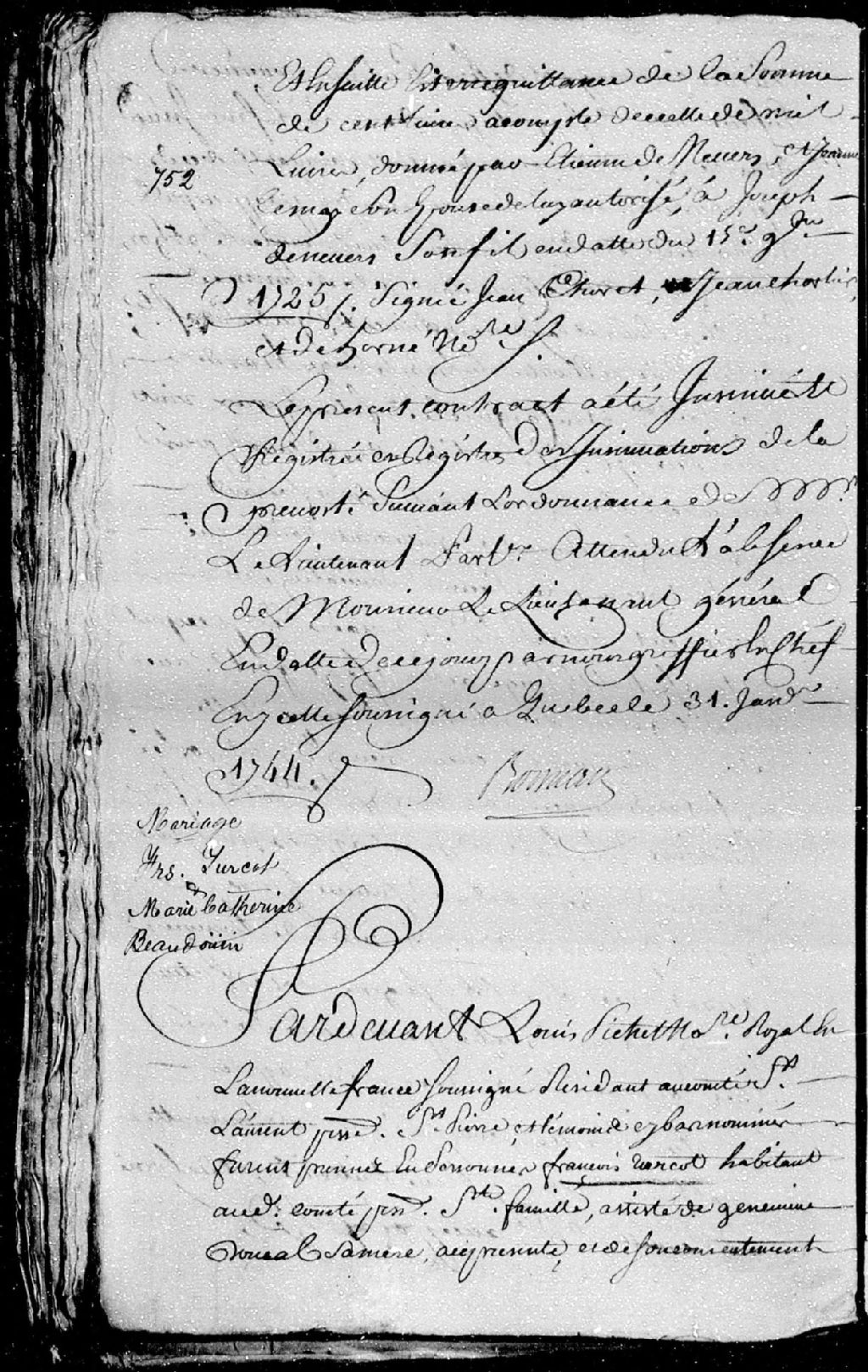 Contrat de mariage passé pardevant Louis Pichet, notaire royal en la Nouvelle-France, entre François Turcot, habitant au comté de Saint-Laurent, paroisse Saint-Famille (île d'Orléans), fils de Geneviève Dorval (Bouchard dite Dorval), sa mère; et Marie-Catherine Beaudoin, fille de Marc Beaudoin, major de milice audit comté de Saint-Laurent, et d'Élisabeth Lepage, ses père et mère, demeurant en la seigneurie d'Argentenay, paroisse Saint-François-de-Sales
