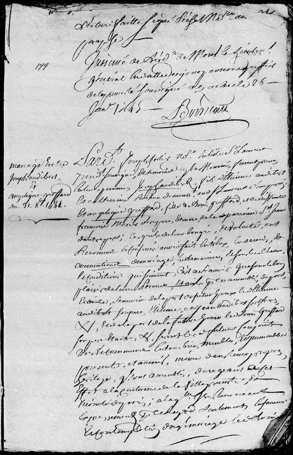 Contrat de mariage passé pardevant Joseph Fortier, notaire en l'île Saint-Laurent (île d'Orléans), entre Joseph Audibert, fils d'Étienne Audibert et de Catherine Rochon (Rocheron), ses père et mère, demeurant en ladite île Saint-Laurent; et Angélique Greffard, fille de Louis Greffard et de défunte Claire-Françoise Morier, ses père et mère, de la paroisse Saint-Jean