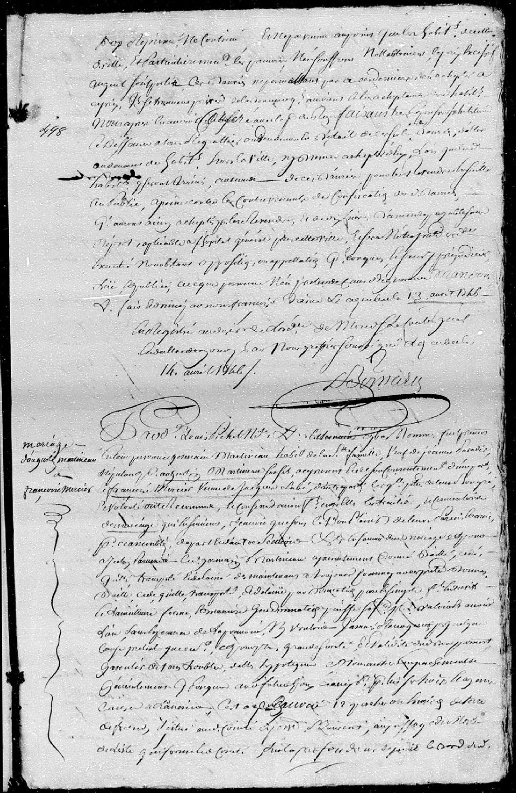 Contrat de mariage passé pardevant Louis Pichet, notaire royal, entre Augustin Martineau, fils de Germain Martineau, habitant du comté de Saint-Laurent, paroisse Sainte-Famille (île d'Orléans), et de défunte Jeanne Paradis; et Françoise Mercier, veuve de feu Jacques Labé (Labbé)